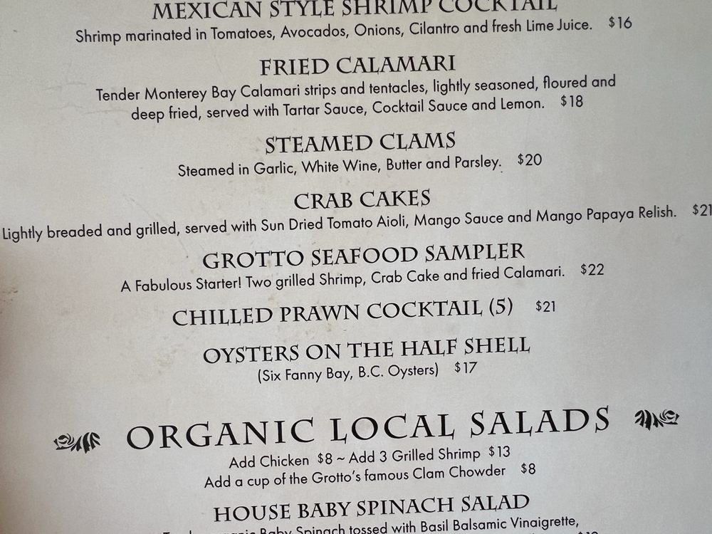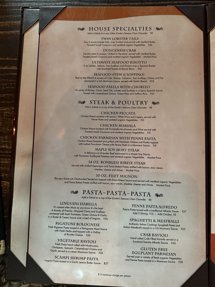 Old Fishermen's Grotto, located in Monterey, CA, offers a unique dining experience with its blend of steakhouses, Italian, and seafood dishes. Known for its award-winning Monterey Style Clam Chowder, this restaurant also provides a variety of appetizers like Grilled Artichoke and Oysters Rockefeller. The menu boasts organic salads and enticing entrees like Parmesan Crusted Rock Cod and Macadamia Crusted Halibut. The restaurant's ambiance, reminiscent of old-school East Coast eateries, adds to the overall charm. While some dishes may not hit the mark for everyone, the waterfront views and friendly staff make it a worthwhile visit. From the efficient service to the delicious seafood options, Old Fishermen's Grotto offers a dining experience that seafood lovers will enjoy.